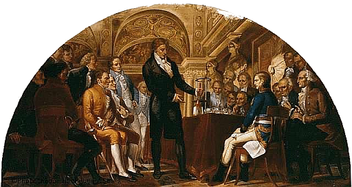 Napoléon porta toujours un intérêt certain aux progrès techniques et scientifiques. Ici, on voit Alexandre Volta qui présente en 1800 au Premier Consul sa découverte : la pile électrique