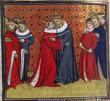 Comme il est d’usage pour le vassal et son suzerain, le roi d’Angleterre Edouard Ier, qui possède le duché de Guyenne, donne le baiser au cours de la cérémonie d’hommage au roi de France.