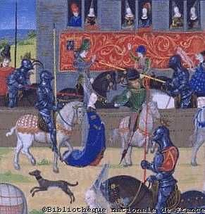 Seuls les chevaliers pouvaient participer aux joutes et aux tournois. Ces compétitions étaient le spectacle le plus apprécié du public durant tout le Moyen Âge. Le tournoi était solennellement ouvert par un héraut (officier chargés de faire des proclamations solennelles), qui annonçait sur les places publiques l’intention du roi ou d’un grand seigneur de rassembler pour cette fête les chevaliers les plus réputés du pays. Autour d’une vaste esplanade, appelée lice, les participants avaient élevés leurs riches tentes ou pavillons. Au sommet de la lance plantée à l’entrée était suspendu le bouclier avec les armoiries du seigneur. Le tournoi durait habituellement plusieurs jours. Les épreuves étaient variées et dotées d’un riche prix. Les adversaires s’affrontaient avec des armes dites « courtoises », c’est-à-dire rendues inoffensives ou presque (les accidents étaient fréquents) : les lances étaient épointées et les épées privées de leur tranchant. Alors que la joute voyait s’affronter deux cavaliers séparés par une barrière ou une corde, la « mêlée » consistait en une véritable bataille rangée entre deux groupes de cavaliers égaux en nombre. La mêlée se déroulait en champ libre, et bien qu’il existât quelques règles comme celle de ne pas frapper d’estoc, elle était très violente ! Il n’était pas rare de sortir des morts du terrain d’affrontement. Au XVe siècle, se formèrent des compagnies de chevaliers dont l’unique but était de favoriser des tournois. Pour les jeunes fils cadets d’aristocrates, le tournoi devenait une véritable profession. A en croire les chroniqueurs, les combats devinrent de plus en plus spectaculaires. Il y avait parfois d’autres compétitions comme la lutte libre, le tir à l’arc, à l’arbalète ou à la fronde.