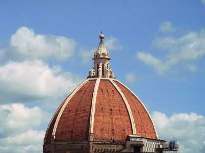 Un prodige technique : le dôme de Brunelleschi. Parvenu à cette hauteur, les méthodes de construction habituelles consistant à recouvrir l’édifice de terre ne sont plus applicables. L’architecte à recours à un système élaboré de portances en rayons pour bâtir le dôme, qui fit la renommée de la cité de Florence toute entière.