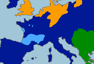 - L’Angleterre d’Elisabeth Ière qui écrasa l’Invincible Armada de Philippe II (1588) annonçant ainsi le début de la domination maritime de la Navy. En Allemagne, les Habsbourg durent faire face à l’expansion du protestantisme chez les princes allemands du nord. De longs conflits affaiblirent le Saint-Empire, en 1555, la paix d’Augsbourg consacre le clivage religieux du pays. Plus pragmatique, la France, qui est restée catholique, continue sa lutte contre les Habsbourg d’Espagne et d’Allemagne, pourtant des coreligionnaires. Au XVIIe siècle, l’Europe entière se déchire au cours de la guerre de Trente Ans. Le conflit s’achève avec le traité de Westphalie (1648) qui reconnaît les trois confessions, catholique, luthérienne et calviniste dans le Saint-Empire et qui remodèle les frontières de l’Europe pour de longues années.