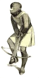 - L’arbalète à croc : tout en maintenant l’arbalète des deux mains, le soldat engageait son pied dans un étrier et tendait la corde en poussant l’arme.