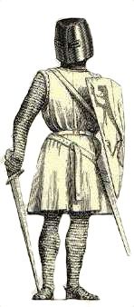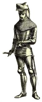 | XIIe siècle - Haubert de mailles long, casque conique à nasal | XIIIe siècle - Cotte de mailles complétée de chausses et de gantelets, surcot, heaume cylindrique | XIVe siècle - Gambison et haubert, surcot, cubitières, genouillères et grèves | XVe siècle - Armure de plates complète, gorgerette de mailles et bassinet |