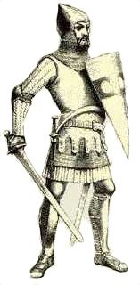 - L’épée : C’est l’arme la plus utilisée par l’homme d’arme du Moyen Âge. L’époque carolingienne voit s’installer l’épée longue (les Romains utilisaient des épées courtes). Elle devint alors une arme noble et le chevalier lui donnait parfois un nom (Durandal, l’épée de Roland). A la fin du XIIe siècle, la poignée devient plus longue pour être portée à deux mains. On distingue deux types d’épées, lames légères et lourdes qui servent à frapper d’estoc ou de taille (de la pointe ou du tranchant), les chevaliers possédaient souvent les deux types de lame.