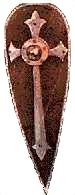 | Bouclier Vicking avec l'umbo au centre | Bouclier Normand du XIe siècle | Écu en V du XIIIe siècle |