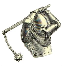 - Le fléau : C’est un manche de bois muni d’une chaîne métallique sur laquelle est accroché une masse de fer, les Français ne l’utilisaient que très peu. Elle était particulièrement destructrice pour les hauberts, elle fut ensuite rallongée, pour atteindre les cavaliers. La masse était généralement sphérique et armé de pointes. Une variante du fléau : le goupillon possédait plusieurs chaînes garnies de boules à pointes acérés.